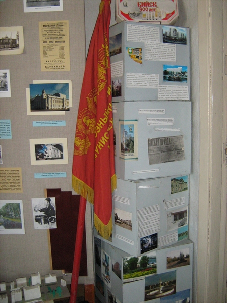 Экспозиция музея «История и культура города Бийска» размещена на передвижной стене, представляющей собой четырехстворчатую ширму, и на переносных кубах, составленных в виде пирамиды, на которых располагаются фотографии, копии документов, предметы нематериальной культуры. Все это делает основную экспозицию мобильной, позволяющей организовывать передвижные выставки.